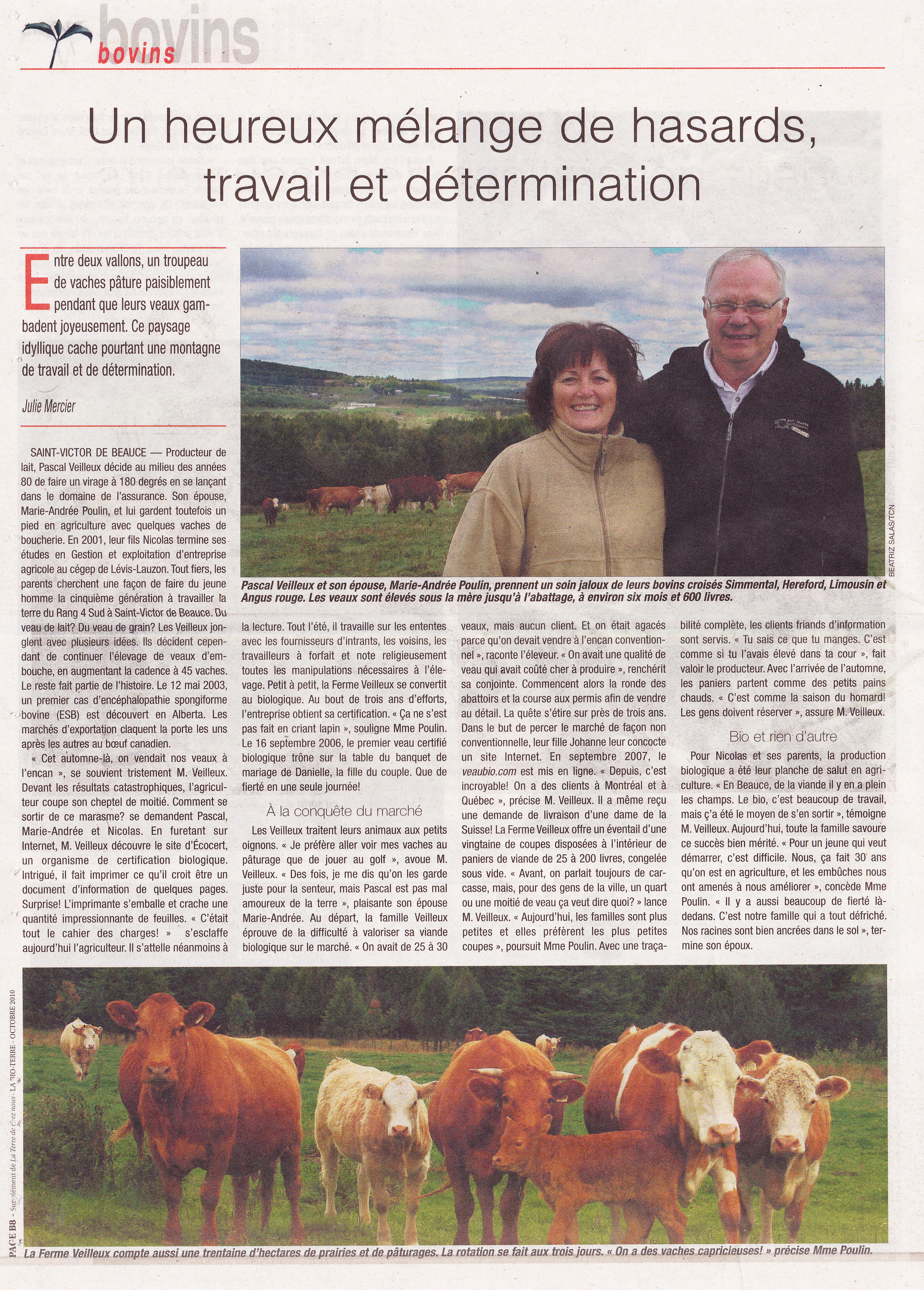 La Ferme d’élevage Veilleux a vu passer 5 générations d’une même famille. Les Veilleux ont fait la production de vaches laitières pendant de nombreuses années puis ils ont fait la transition vers les vaches de boucherie en 1992. C’est en 2004 qu’ils ont entrepris les démarches pour obtenir la certification biologique. Le processus pour obtenir une telle certification dure 3 ans. Avant les animaux, ce sont les sols qui doivent devenir biologiques. Ainsi, un producteur qui désire produire de la viande biologique certifiée doit, peu à peu, modifier tous les intrants (semences, engrais, nourriture, etc.).